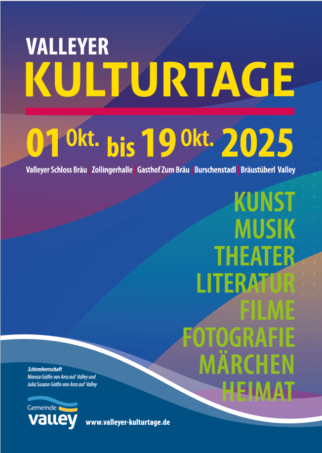 Kaum sind zwei Jahre vergangen, freuen sich Valley und der Landkreis Miesbach auf die nächsten VALLEYER KULTURTAGE! Vom 01. bis 19. Oktober zaubern Valleyer Künstlerinnen und Künstler aus allen Kultursparten einen bunten Regenbogen an kulturellen Darbietungen. Auch dieses Jahr sind alle Veranstaltungen kostenfrei. Die Valleyer Kulturszene freut sich natürlich über Spenden, die bei jeder Veranstaltung in den Hut geworfen werden können.